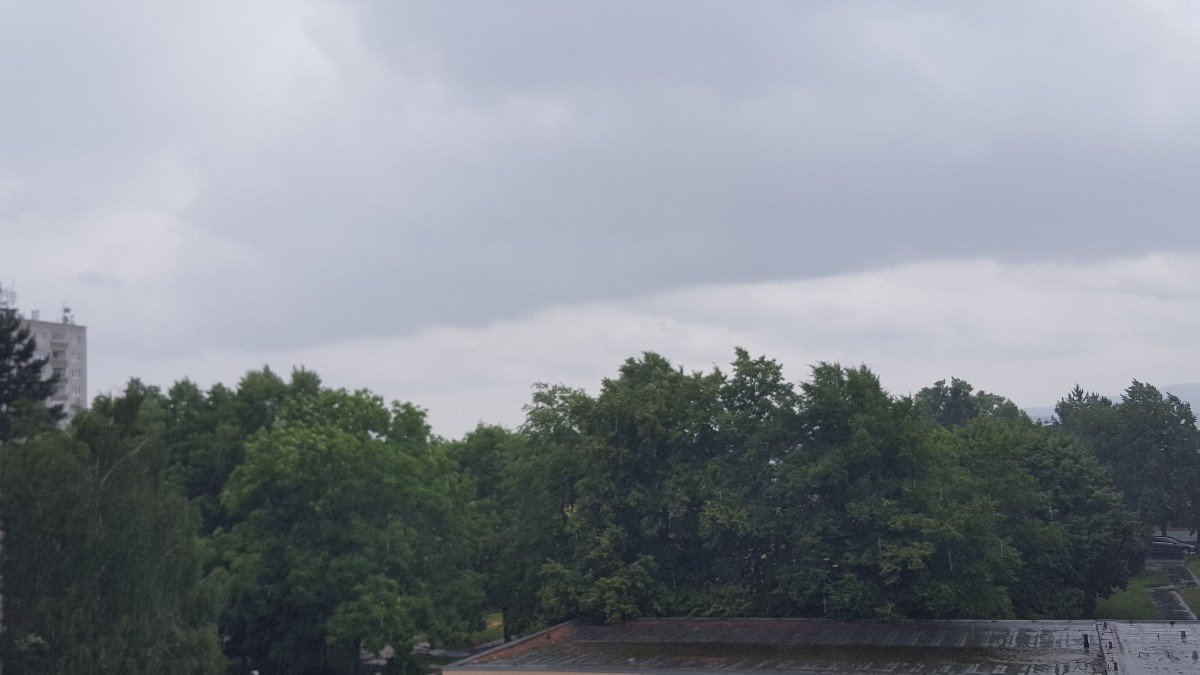 Bouřka(srážky 0,4mm/hod.), oblačnost 100%, tlak 1017,19hPa↓, dohlednost 19km, rel.vlhkost 92,3%, poc.teplota 18,63°C, slabý JJZ vítr 209° 3,48m/s(3 Bft), ozon 333,1D.U., AQI 68(mírné značištění ovzduší).