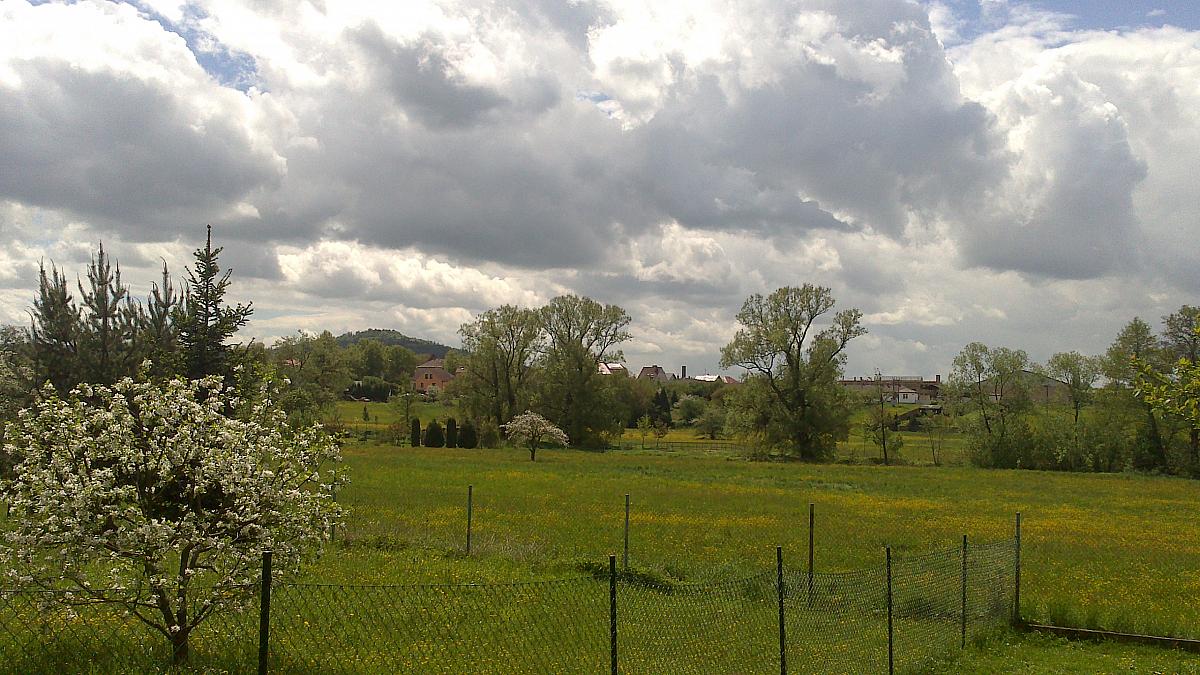 Od západu se nasouvá oblačnost s přeháňkami. Začíná foukat silný nárazový vítr, který vzedmul mraky pylu v okolí. Viz foto.