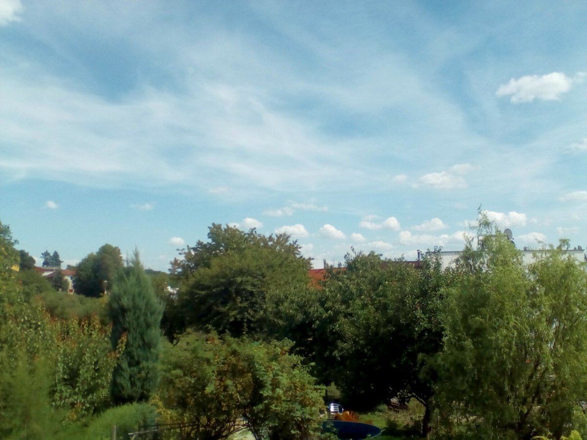 Většinou jen slabý vítr. Pozvolné nasouvání vysoké a na horizontu střední oblačnosti od Z. (viz. foto)