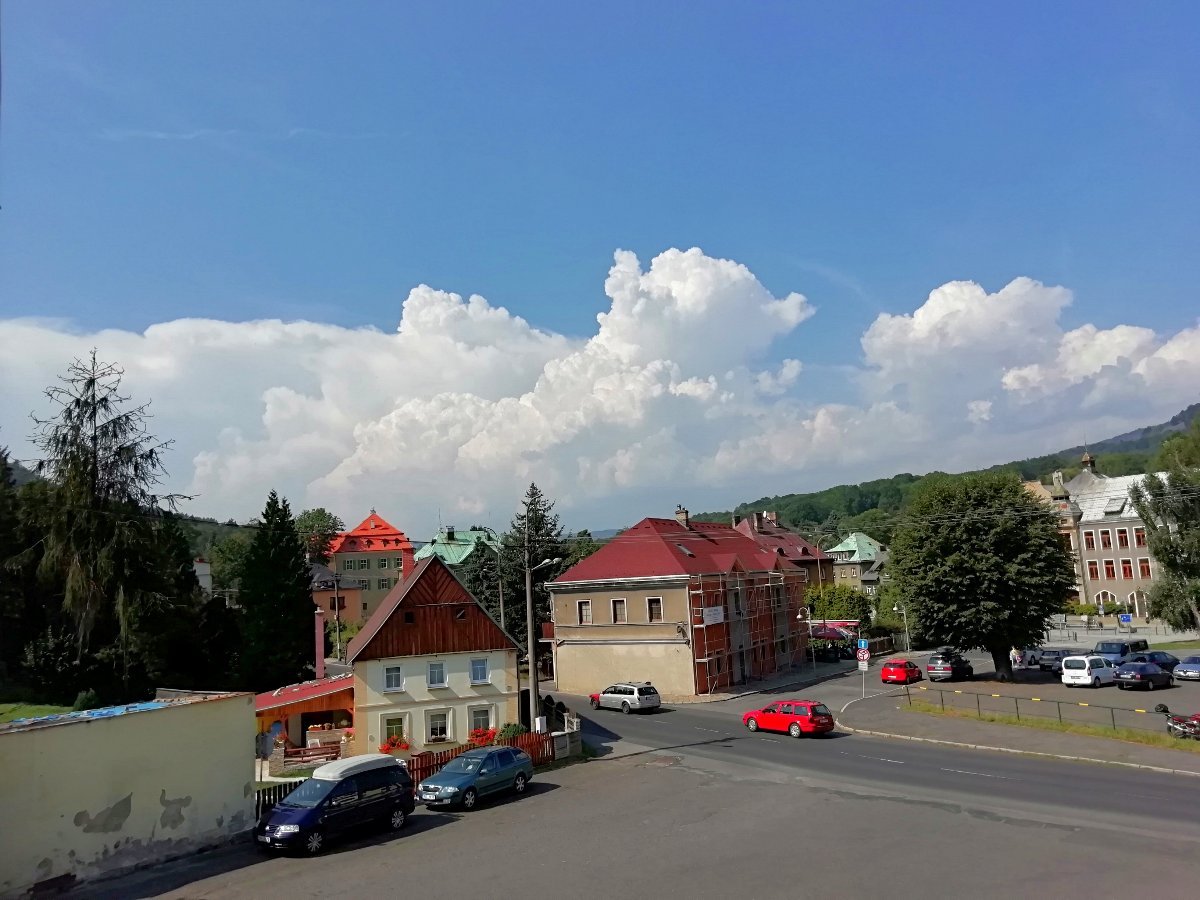 zatáhlo se mrakem z 20 km vzdálené bouřky, další kupovitá oblačnost na obzoru, JZ slabý až mírný vítr, vlhkost 67%