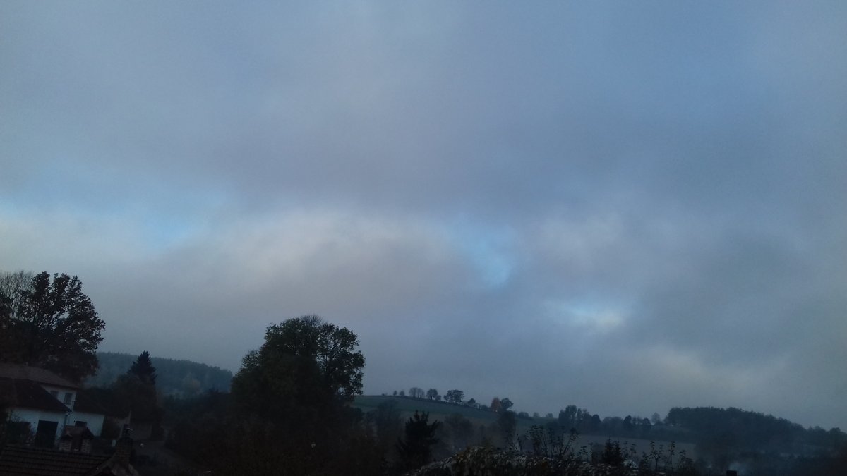 Je hezky. Tlak 1016 hPa, vlhkost 85%, vítr JV 13 km/hod.