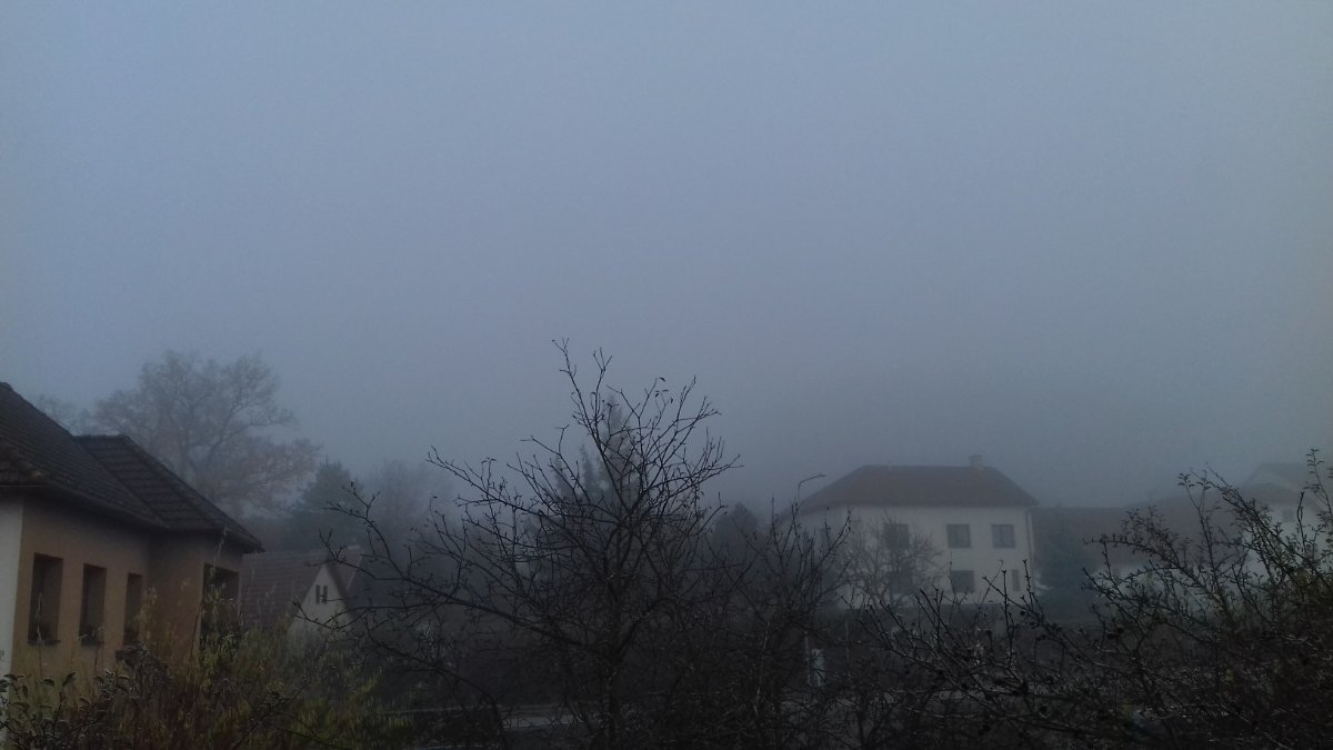 Mlha,přízemní mráz,klidno,tlak 1012 hPa,vlhkost 90%