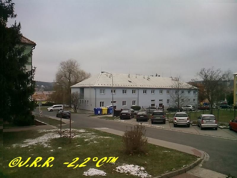Od rána zataženo - slabá mlha, fouká slabý vítr a občas i mírný, je mrazivo a místy leží poprašek sněhu