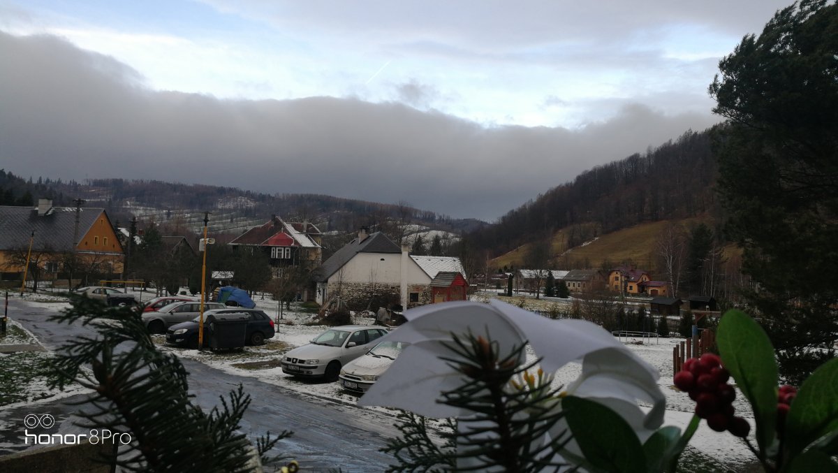 Konečně je příroda bílá. Vítr JV 9,9 km/hod, vlhkost 89%, tlak 10119 hPa.