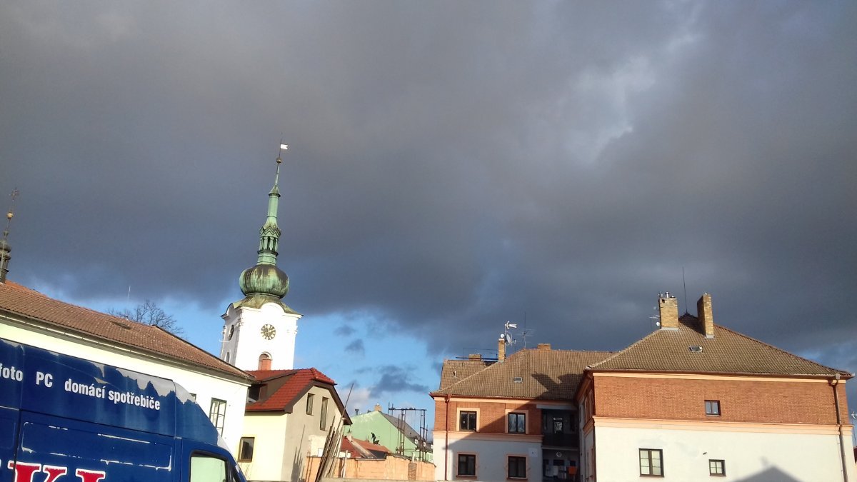 Při dopoledních přeháňkách napad poprašek sněhu který se místy ještě drží,, mírný nárazový vítr
