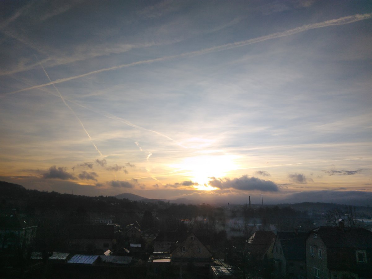 Oblačnost 98,7%, tlak 1013,68hPa→, poc.teplota 5,44°C, tepl.ros.bodu 6,05°C, rel.vlhkost 80,6%, abs.vlhkost 7,20g/m3, slabý V vítr 101° 4,12m/s(3 Bft), ozon 288,2D.U., AQI 38☺(dobrá kvalita ovzduší), včerejší průměrná teplota = 5,51°C.