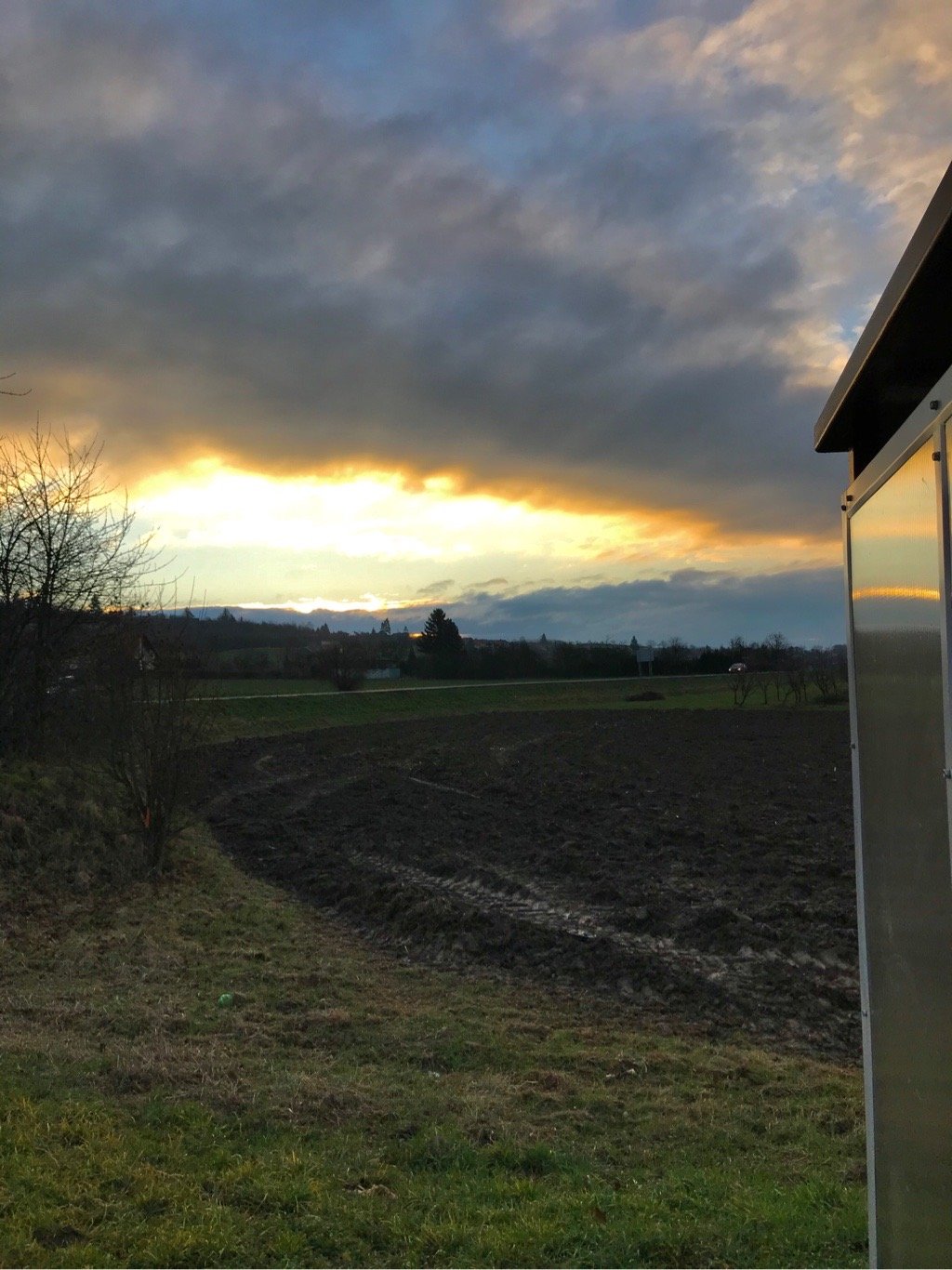 slunce vychází nad obzor, mírný vítr, po slabých dešťových přeháňkách