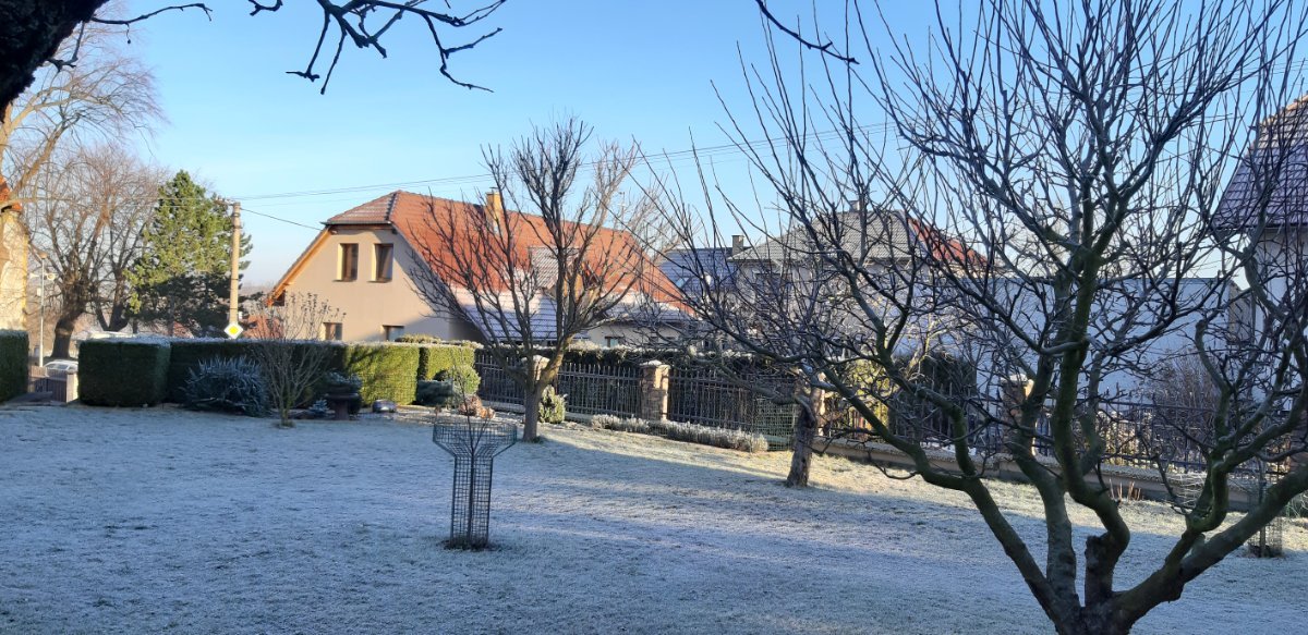 Jasno, bezvětří, tlak 1031,1 hPa, vlhkost 87 %. Dnešní minimum bylo -6,2 °C.
