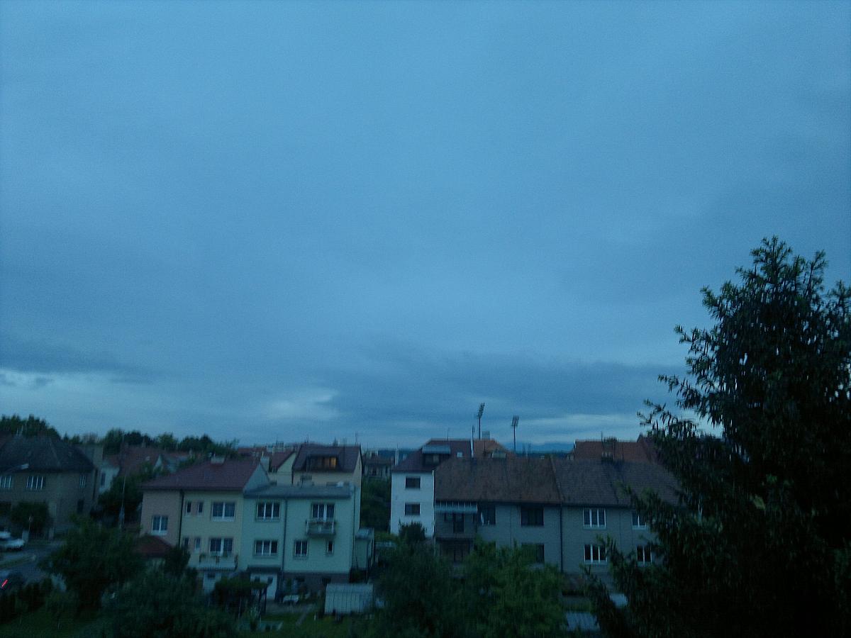 Silný déšť a vítr.Takto vypadala říčka Střela kolem 19h v Toužimi,Napršelo již 24mm.