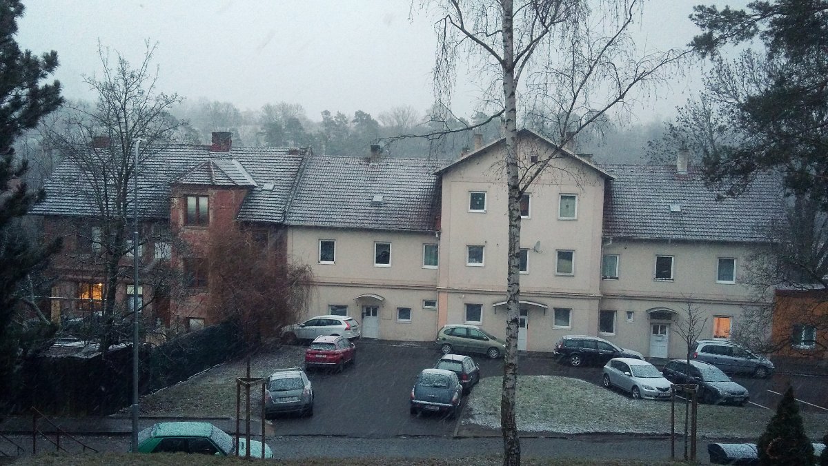Přešla nás silná sněhová přeháňka. Napadl poprašek sněhu. Severní vítr 12,6 km/h, tlak 1009,1 hPa, vlhkost 91 %.