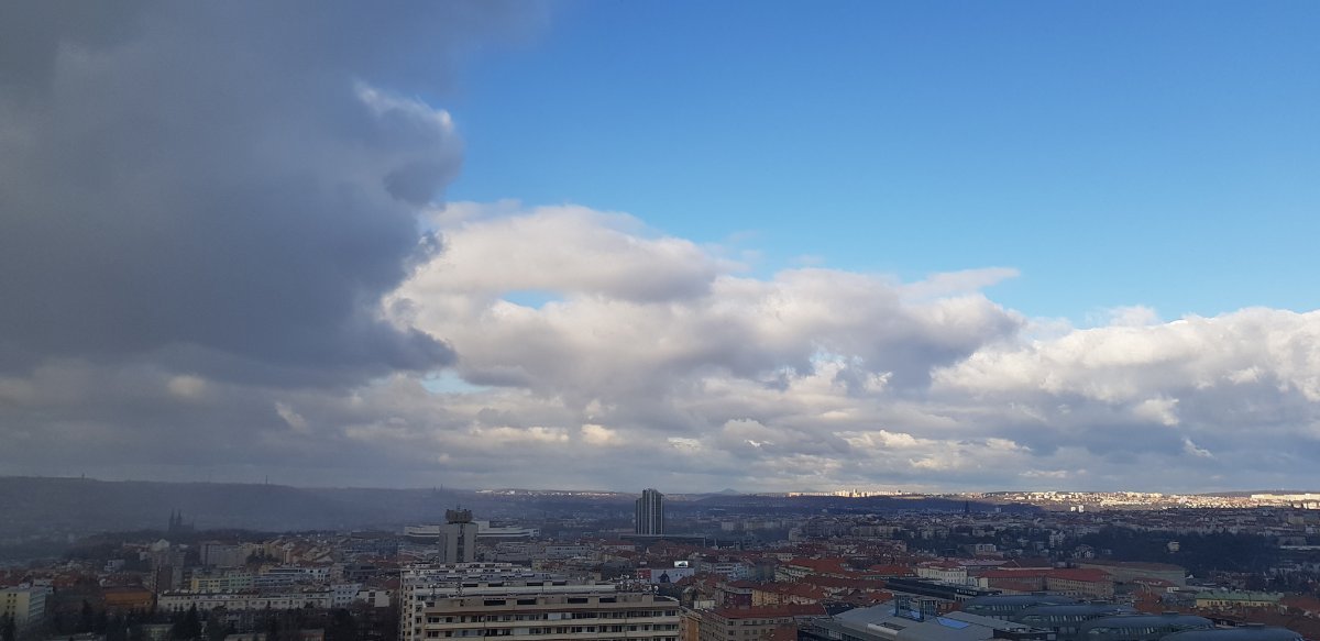 Oblačno, mírný až čerstvý vítr vytváří místy sněhové jazyky, výška sněhu do 4cm, sníh je okolo města, ve městě téměř není, 1°C // nad Borovinou