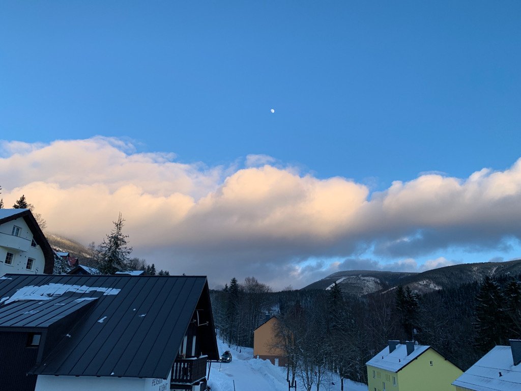 Oblačnost se protrhala na skoro jasno. Severní vítr 8,6 km/h, tlak 1027,4 hPa, vlhkost 68%. Dnešní maximum bylo 2,1 °C.
