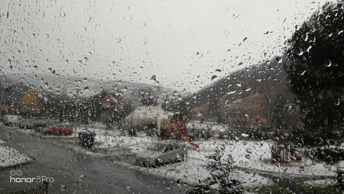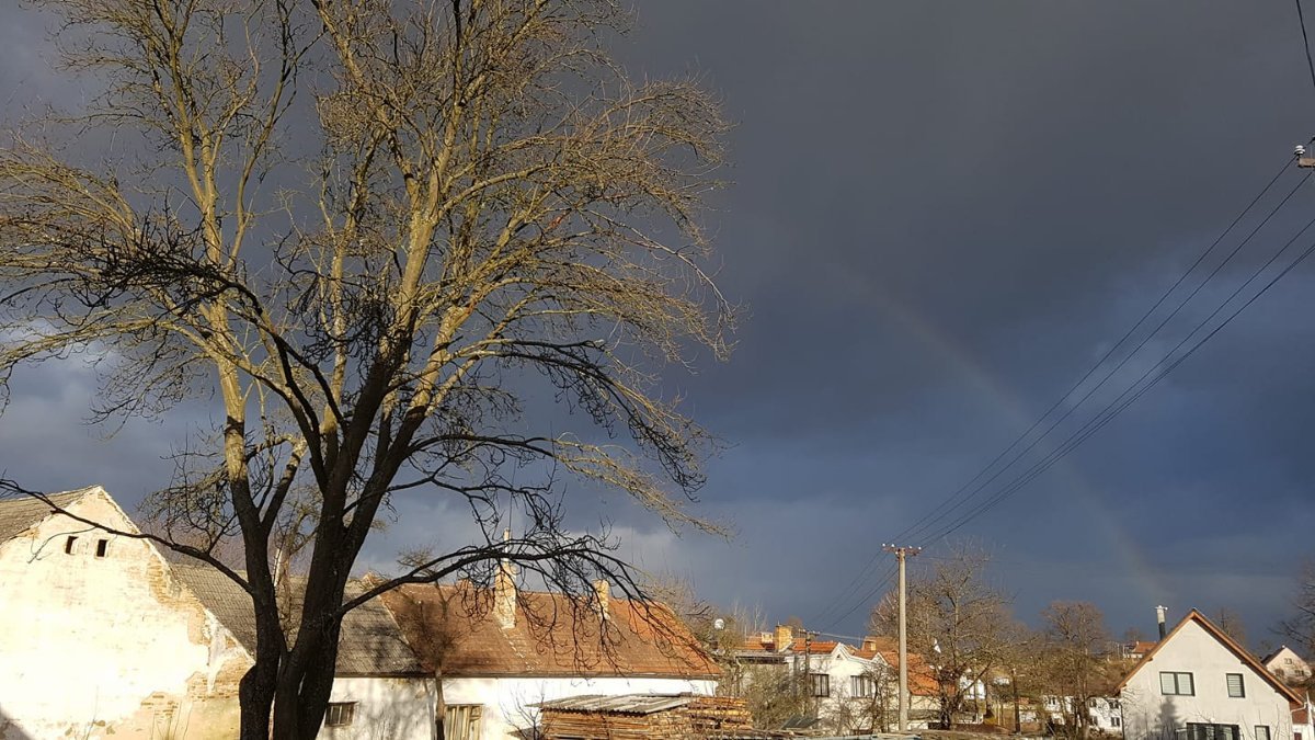 Jižní strana Otěvěka ozářená sluncem , ale severní strana zataženo a duha. Velmi silný vítr.