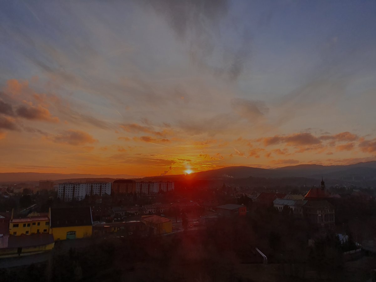 Oblačnost se protrhává,klidno,tlak 1028 hPa,západ Slunce do vysoké oblačnosti.