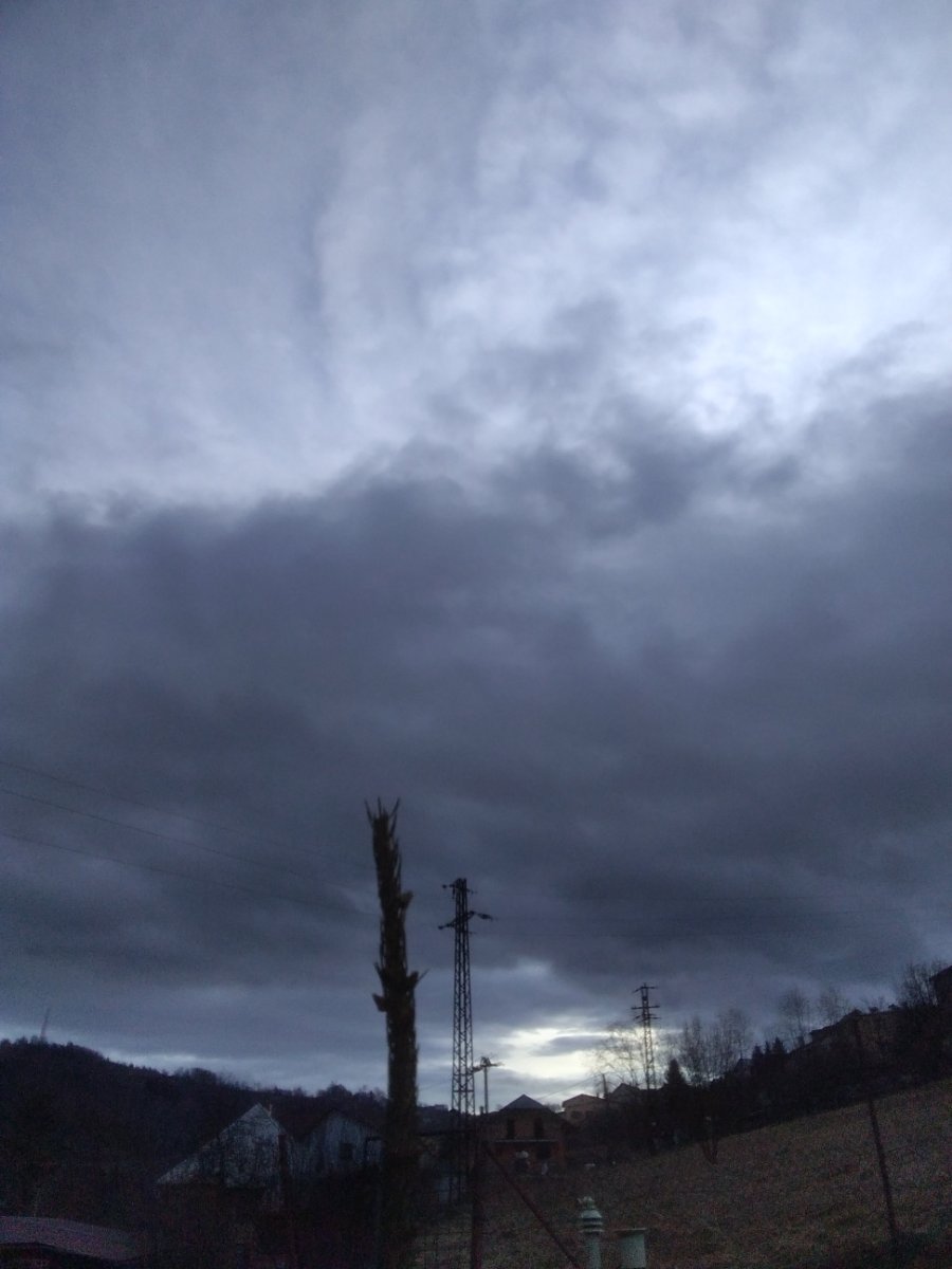 Je zataženo a už spadlo několik kapek. Hlavní déšť se blíží od jihu. Vítr vane slabý.