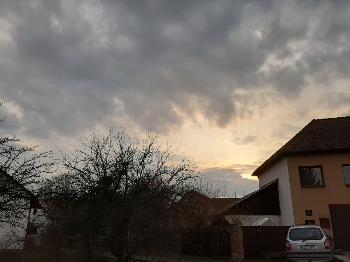Tlak 1019 hPa, vlhkost 43% Po slunečném dni se blíží mraky.