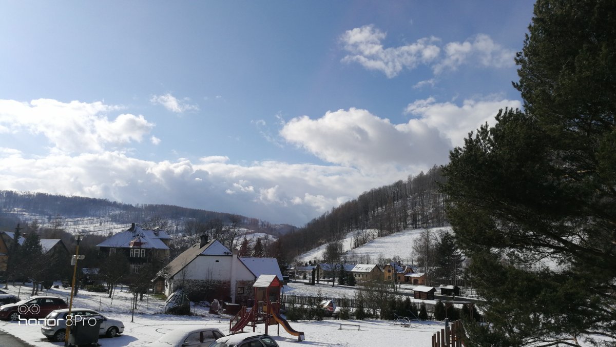 Zamračené, silná snehová prehánka.