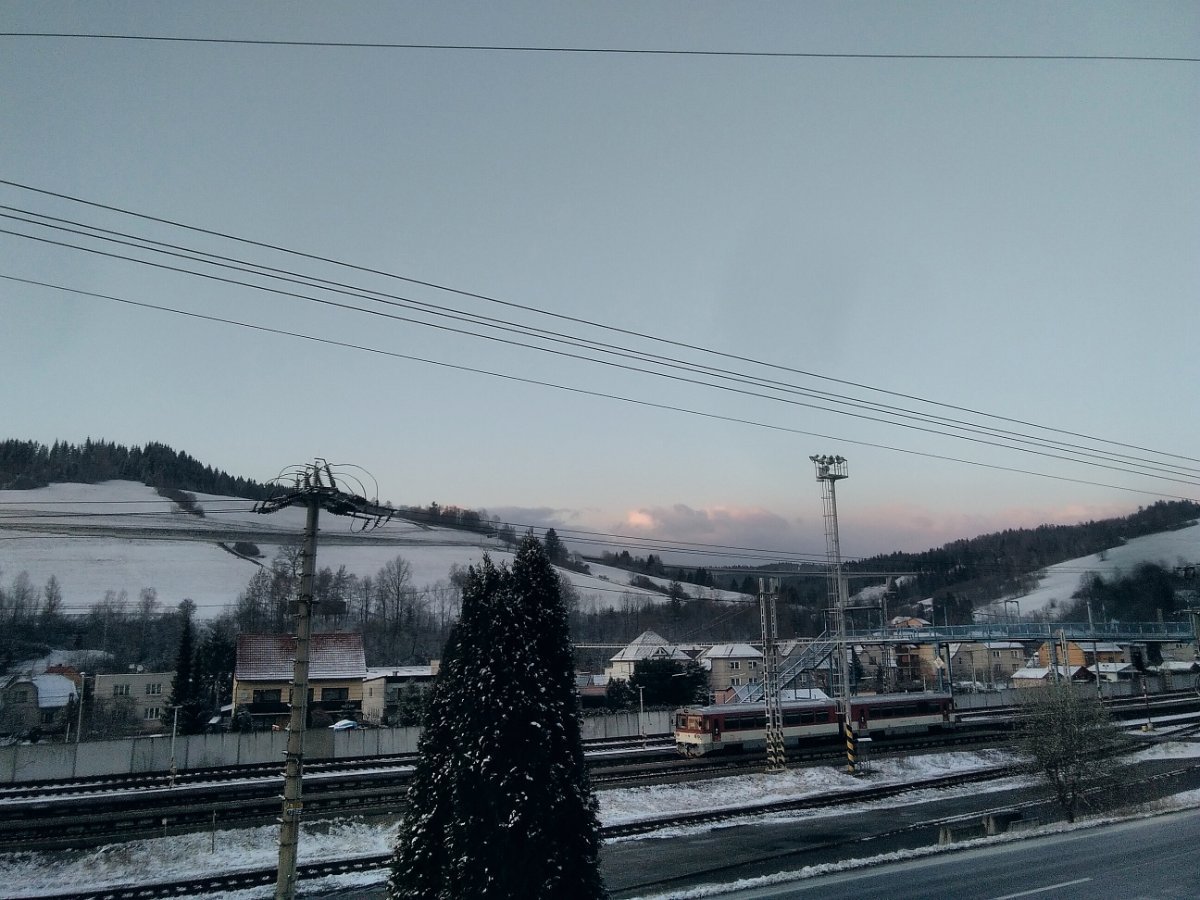 Sněhová přeháňka, dnes už jich bylo několik. Slabý vítr, tlak 1031,8 hPa, vlhkost 68 %. Dnešní maximum bylo 2,6 °C.