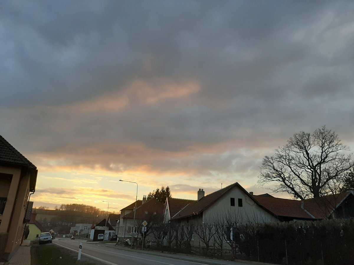 Silnější sněhová přeháňka. Vánek, tlak 1025,9 hPa, vlhkost 87 %. Dnešní maximum bylo 4,9 °C.