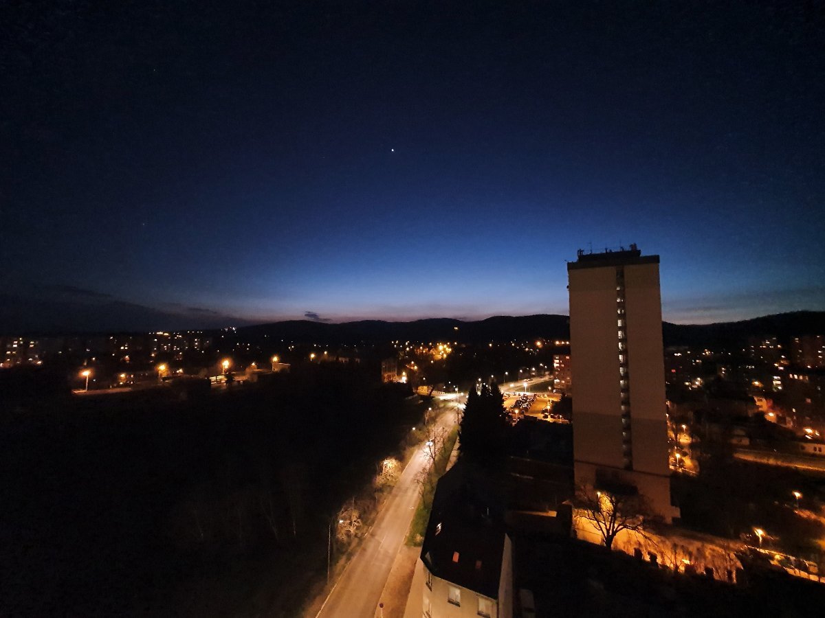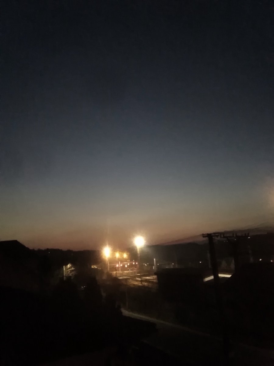 Kvetoucí alej švestek, foceno krátce před 18 hodinou.