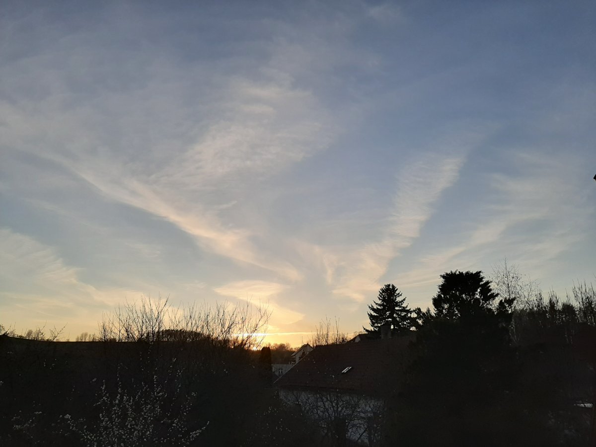Dnešní den byl mrazový s minimem - 0,8°C, odpoledne však bylo už naopak nadprůměrně teplé s maximem 21,4°C. Nyní vane slabý jižní vítr, tlak: 1013hPa. Fotka zachycuje západ slunce u města Olomouc.
