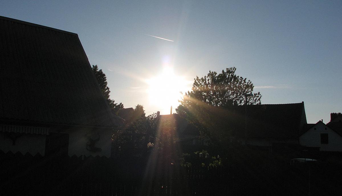 foto z 2013 06 12 v 07:40 zachycuje modrou oblohu a orosené zelené plochy -v 7 hodin ukazoval teploměr +13° - nyní na něj svítí sluníčko tak 32°, odhadla jsem, že mohl vylézti o 1 stupínek :)