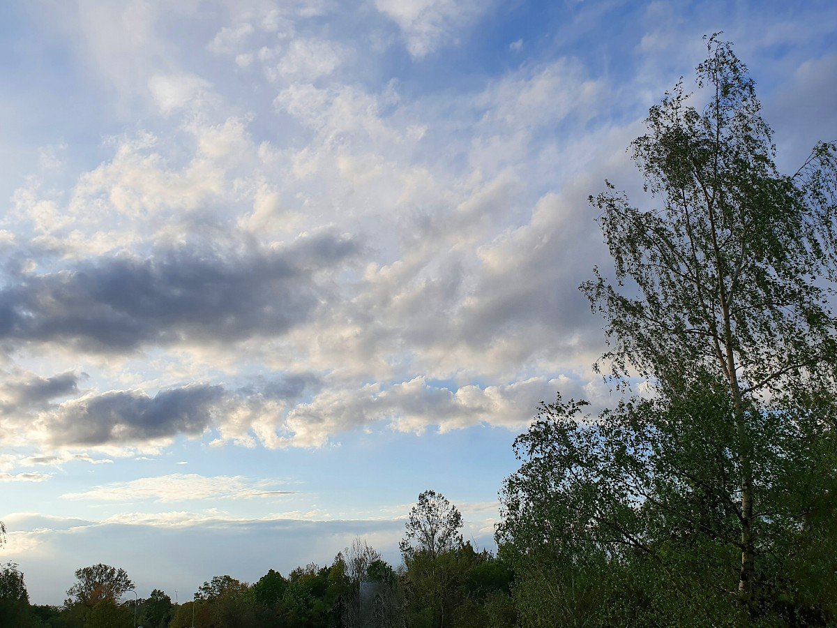 Oblačno, prudká dešťová přeháňka, mírný S vítr, tlak 1014 hPa.