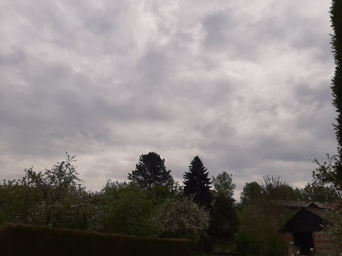 Slabý JV. vítr. Střední a vysoká oblačnost. Nejnižší noční teplota při celonoční mlze byla 11,8°C. Tlak 998,9 hPa, nadále klesá.