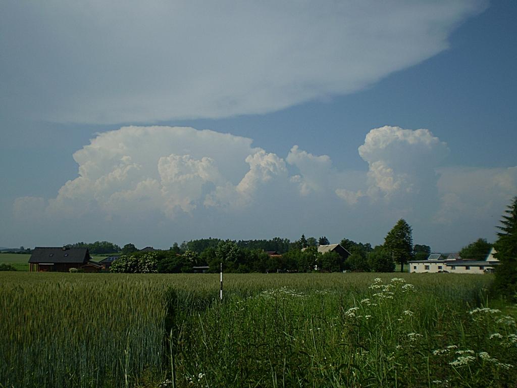 Polojasno bourkovou oblacnosti, na snimku je rozsahla bourka v Krkonosich. Vitr je slaby.