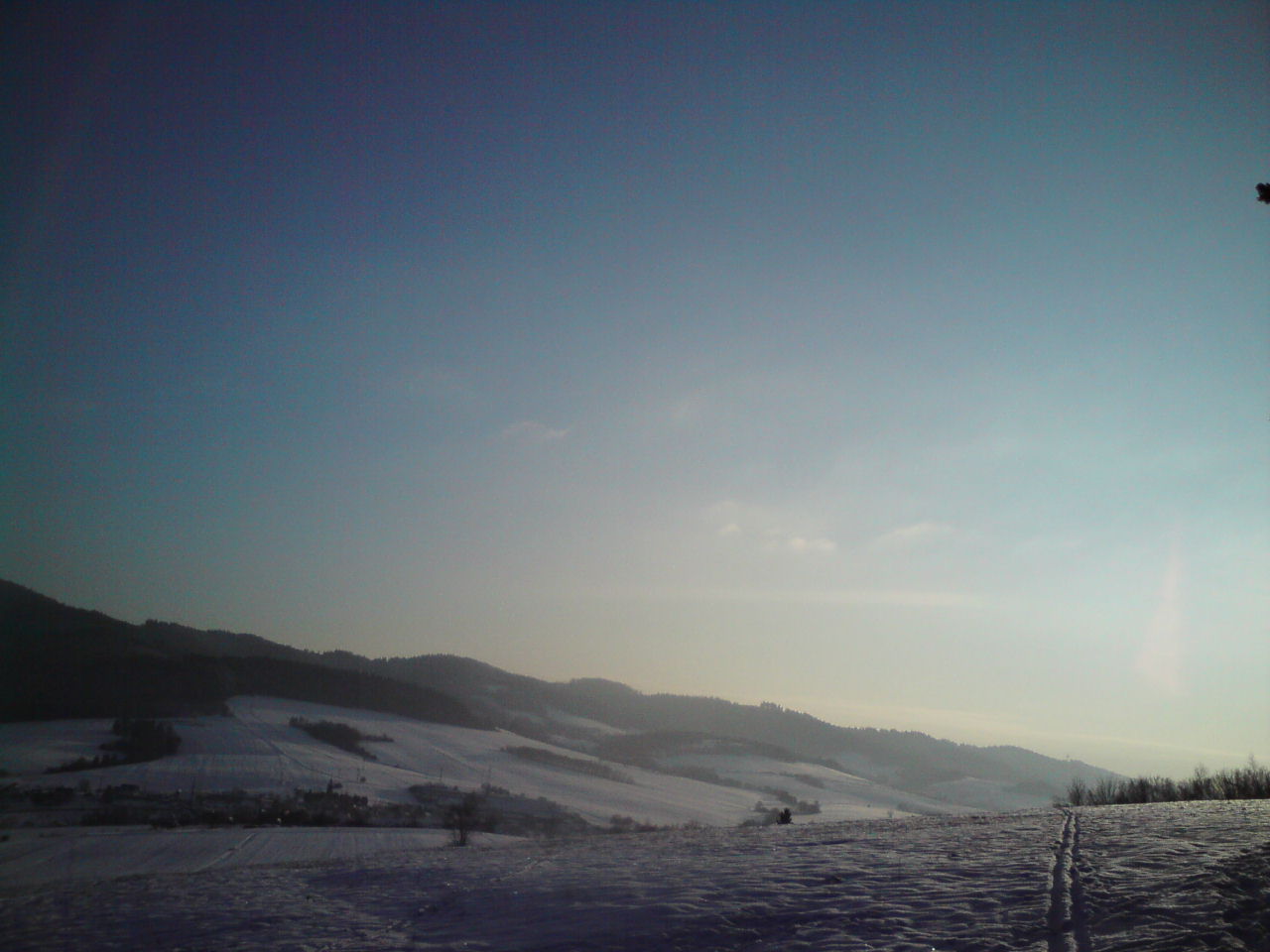 Nízká oblačnost se začíná konečně rozpouštět a teplota výrazně klesá/Tlak:1023hPa/Fouká mírný JV vítr/Sníh:29cm