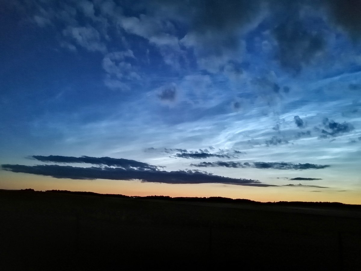 Nezvykle výrazné noční svítící oblaka. Jde jw dokonce vyfotit i mobilem. Je bezvětří, tlak: 1011hPa.