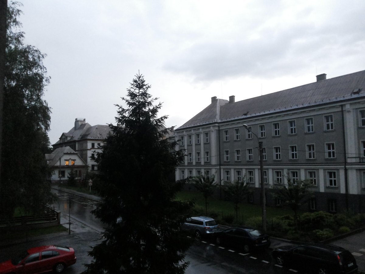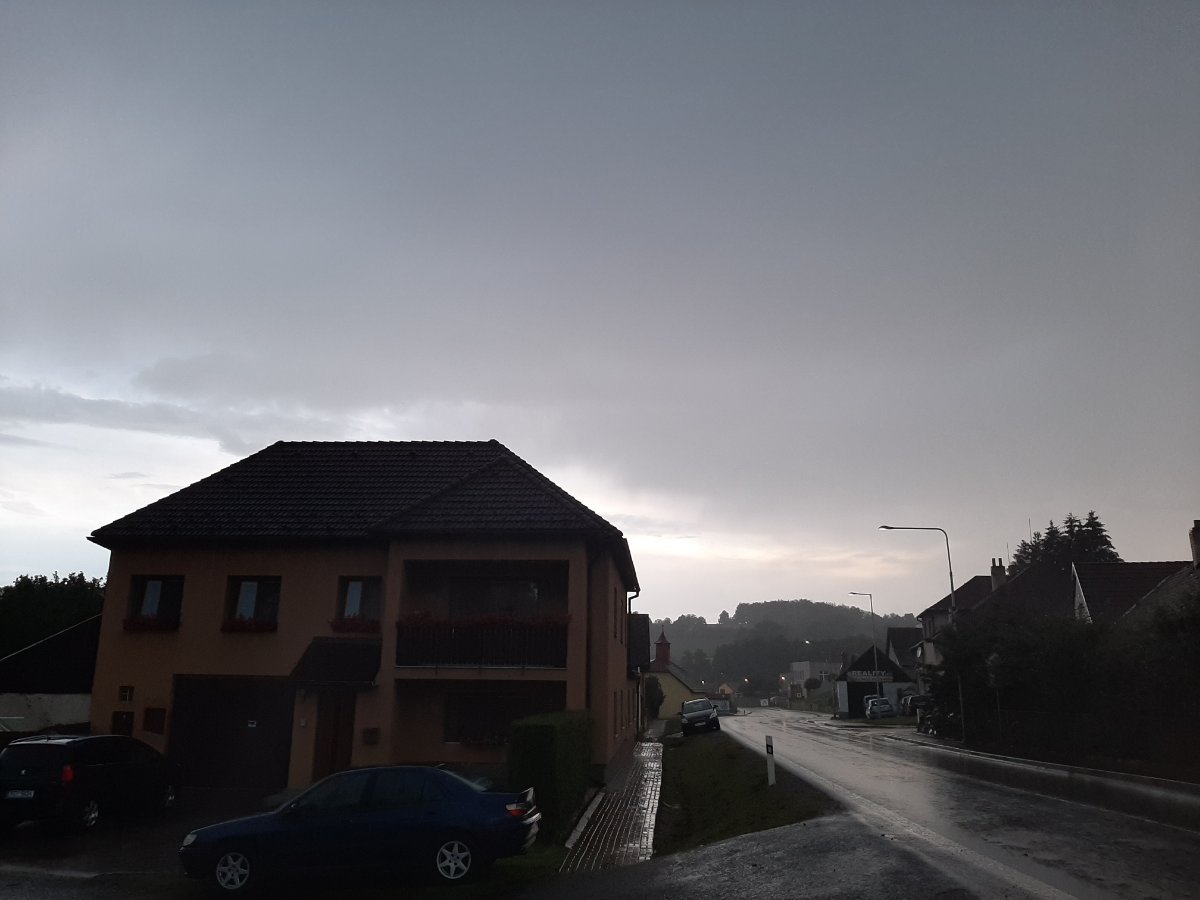 Aktuálně převažuje většinou skoro zataženo a mírně až silně prší už bez bouřky ale udělala se tma a fouká většinou slabý vítr