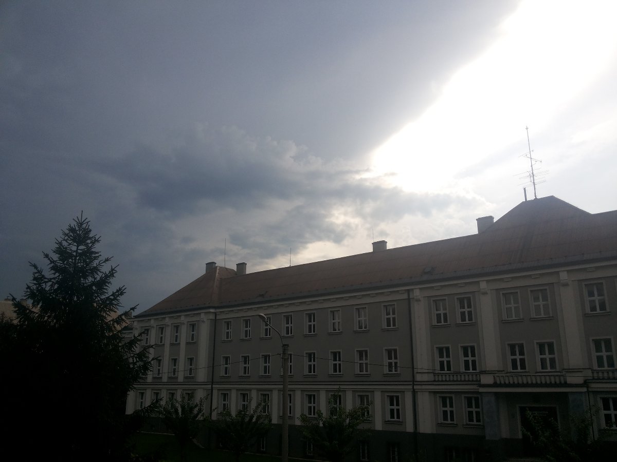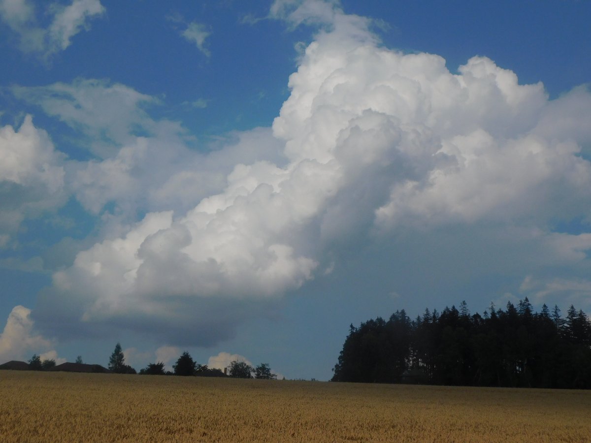 Po slabší bouřce se objevila hezká duha. Slunce je ještě vysoko, takže je jen nízká. Bouřka se při svém postupu k severu rychle rozpadala, takže zatím co na zahradě nám napršelo 7mm na poli, kde mám stanici, o cca 200 metrů dál na sever už jen 5,2mm. Vane mírný jihovýchodní vítr, tlak: 1009hPa.