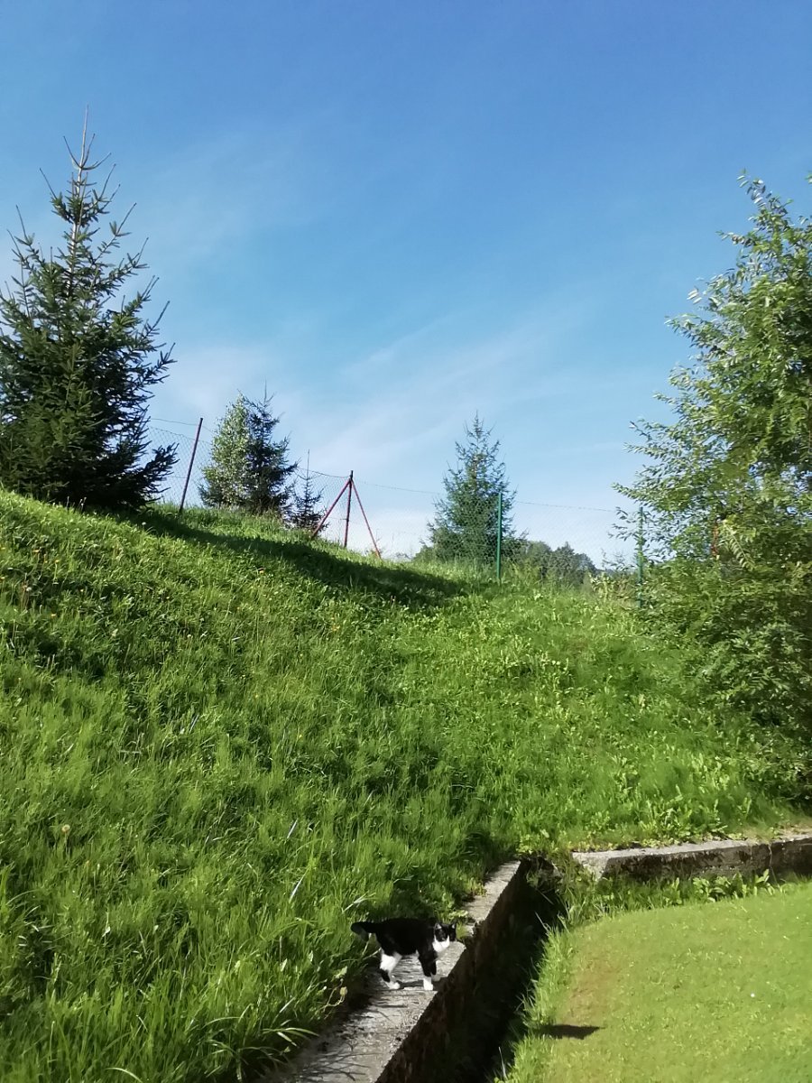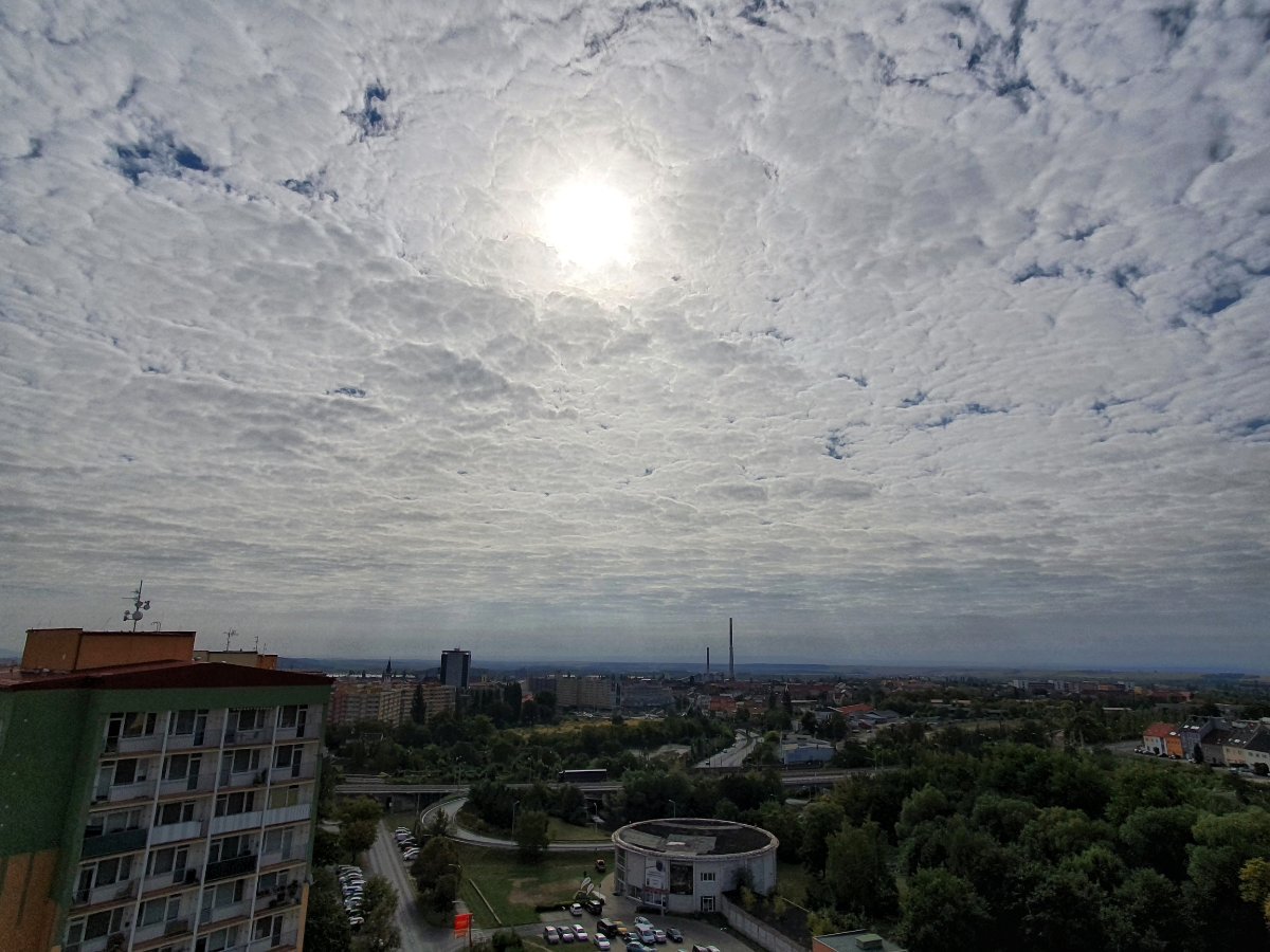 Už několik hodin trvající zajímavé rozdělení oblohy. Směr jihozápad je zataženo, směr severovýchod je jasno. Takto je to už od rána bez většího pohybu. Je bezvětří, tlak: 1018hPa.
