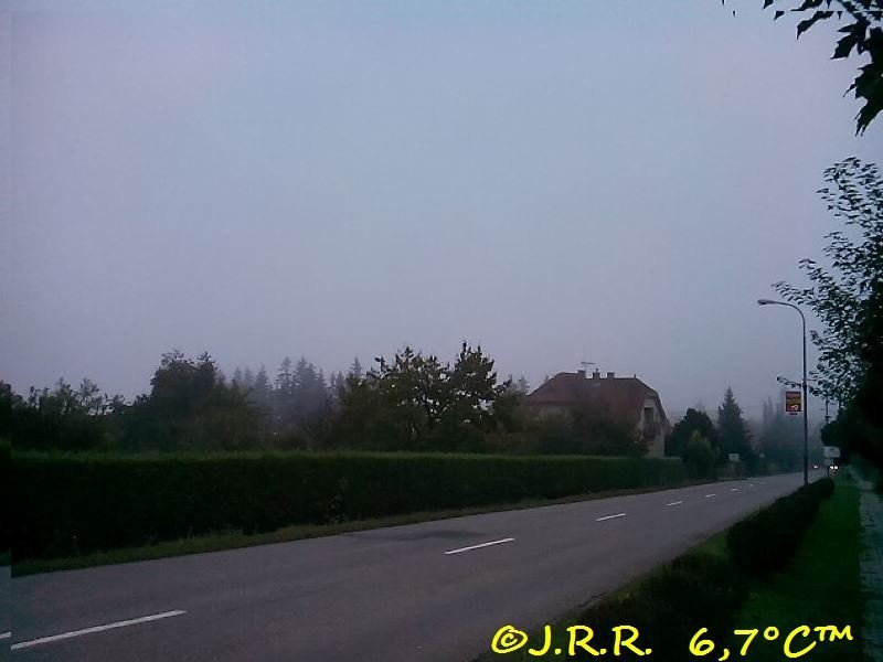 Skoro zataženo, bezvětří až vánek, vlhkost 93%, jemné mrholení