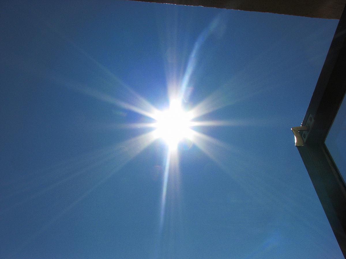 foto z 2013 07 21 v 10:35 modrá obloha, odkvétající kaktus, rozkvetlé květy na slunci - malý deštík by to chtělo