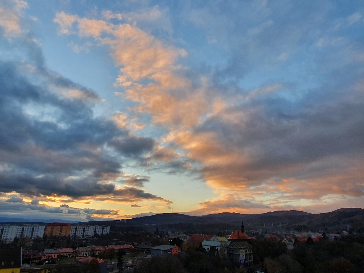 Skoro zataženo, po velmi slabé dešťové přeháňce. Vítr slabý do 3 m/s