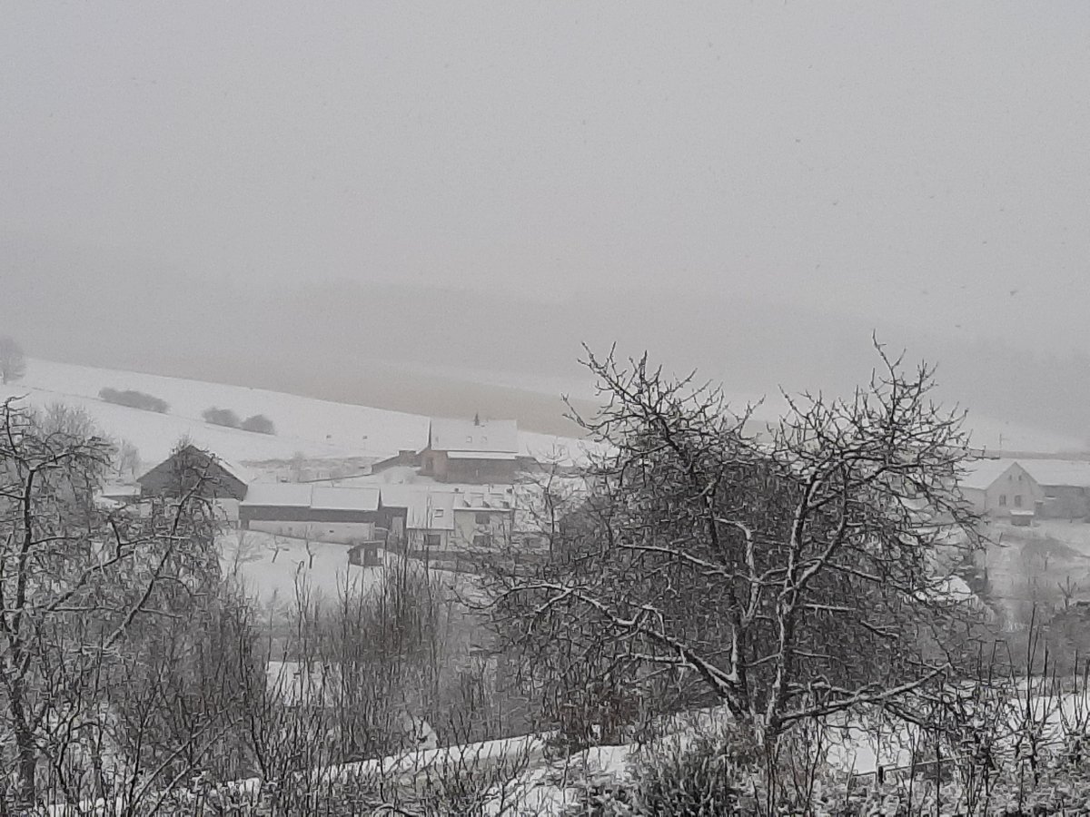 Právě začalo sněžit, leží už 10cm sněhu a ráno bylo až -6°C. Bezvětří.