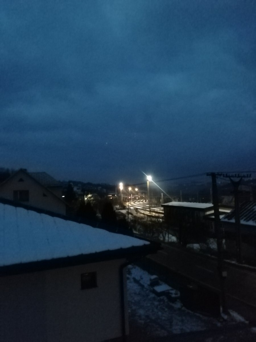 skoro zataženo, občas slabé drobné sněžení, -0.4°C
