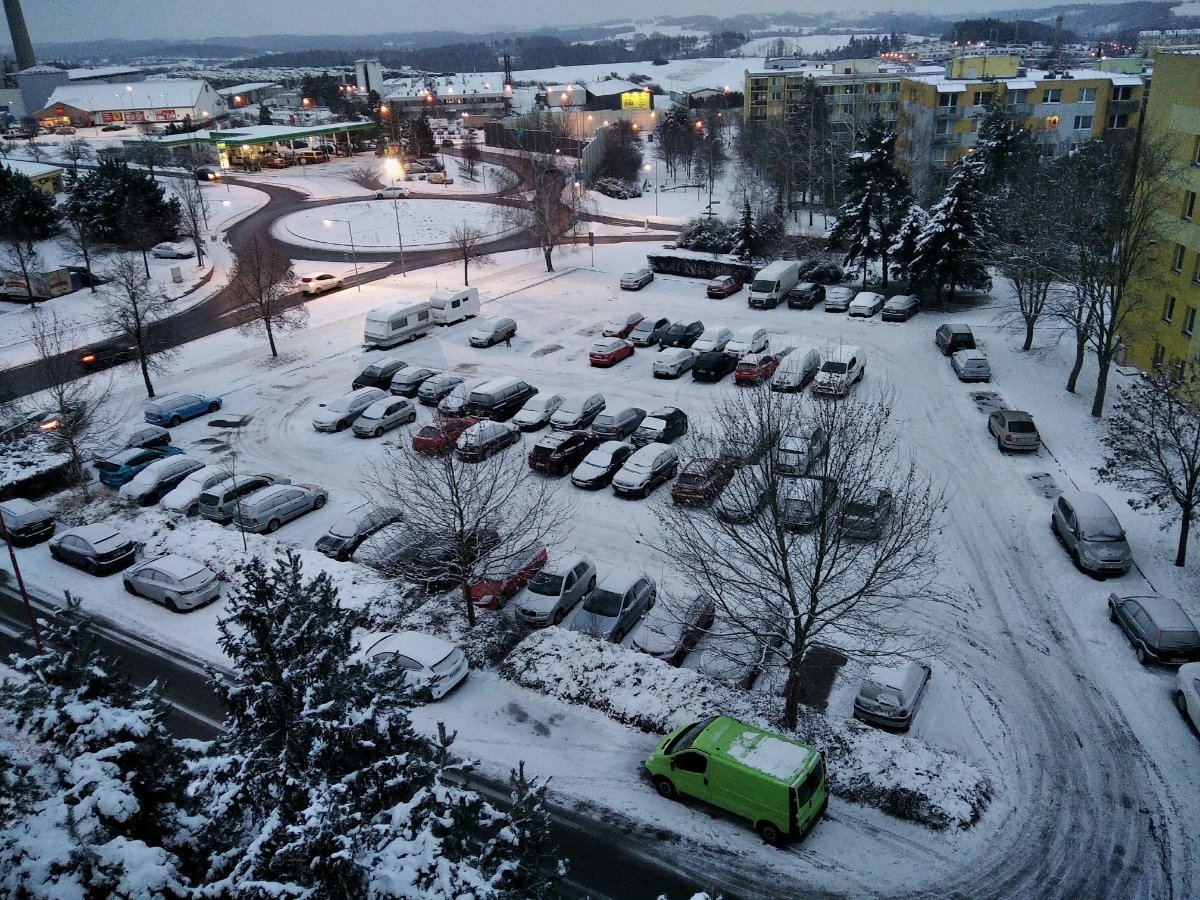 Zataženo, trvalé slabé sněžení, klidno, tlak 1008 hPa.
