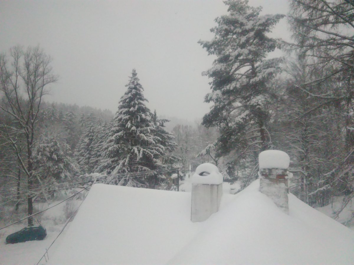 Ranní přeháňka nám zdvojnásobila sněhovou pokrývku z 1 na 2cm. Sníh díky teplotě drží, jen na střechách a betonových plochách roztává. Vane slabý severovýchodní vítr, tlak: 1018hPa.