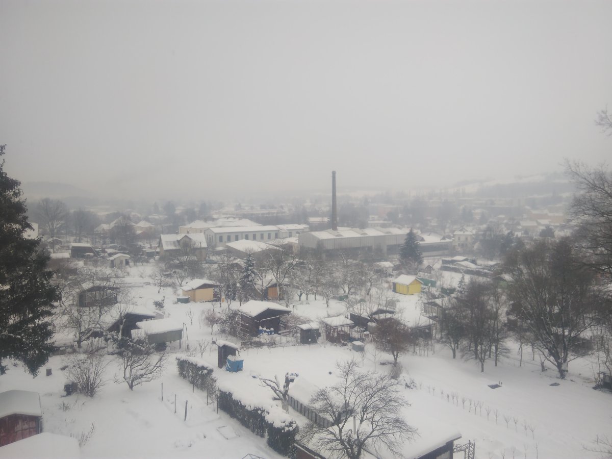 Aktuálně převažuje většinou zataženo a sněhově mrholí a fouká většinou slabý vítr