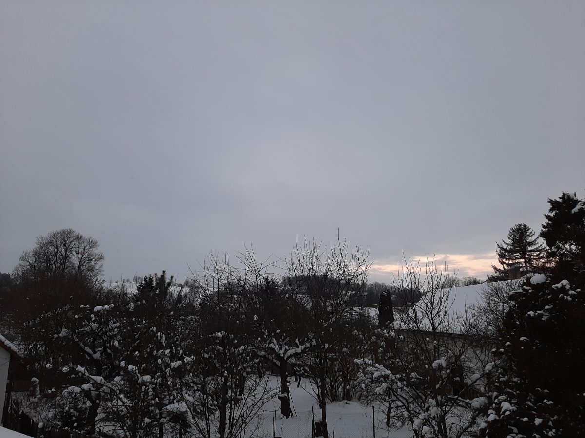-7,7°C necelý metrový rampouch na naší střeše, sníh-30-40cm nemůžu ven, zima, polojasno až oblačno, blíží se sněžení a má napadnout až-5cm sněhu