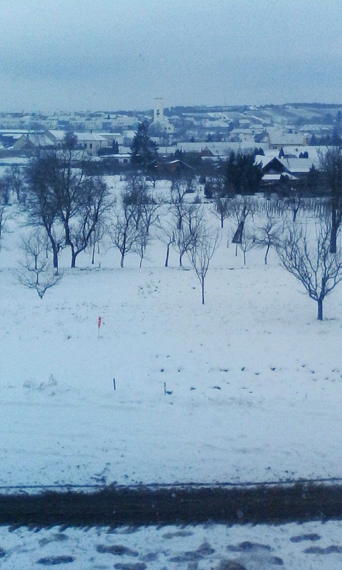 přibližně -2°C silné sněžení, přes noc napadlo do 5cm sněhu, blíží se silné sněžení