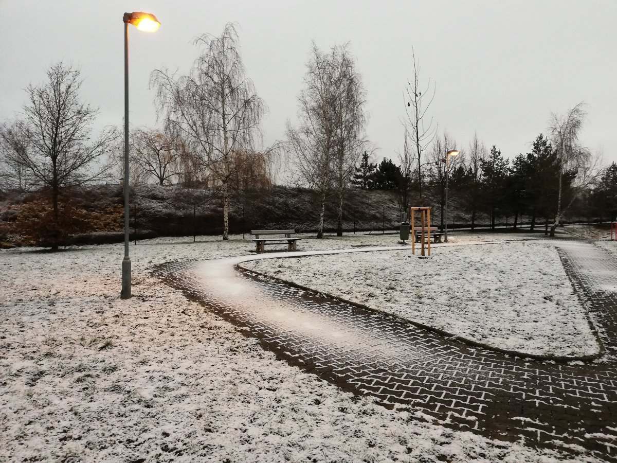 začalo hustě sněžít, klidno, bezvětří a mlhavo