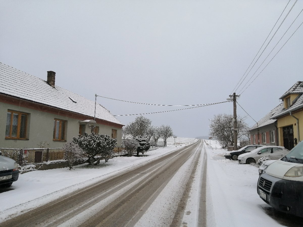 Oblačno, po sněžení, klidno, tlak 1012 hPa.
