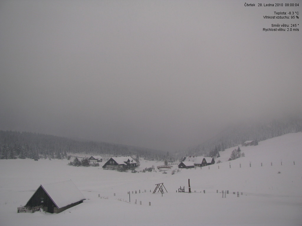 Zataženo, jemně sněží, napadlo 5 a více cm sněhu, nefouká, silnice udržovány.