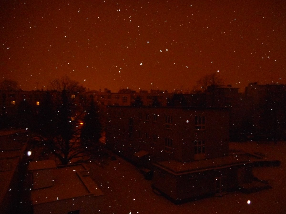 Slabý, občas mírný vítr. Trvalé mírné sněžení.