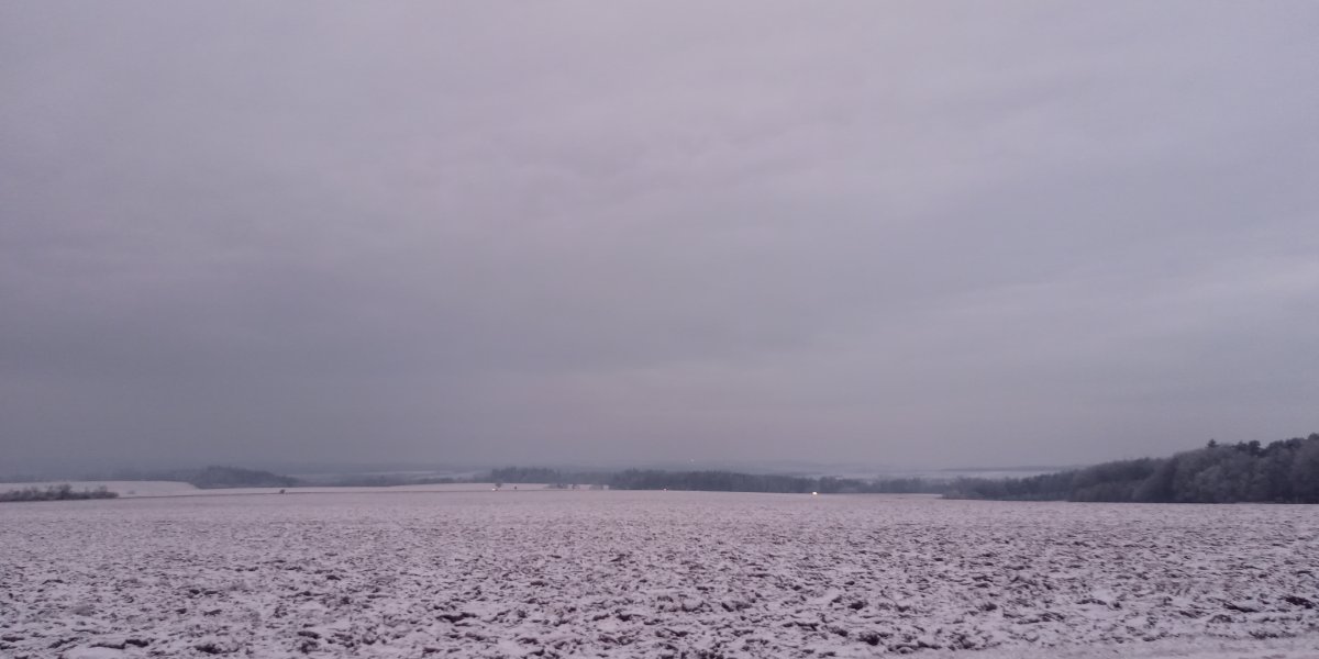 -4,9°C, silná mlha, před chvílí slabě sněžilo.
