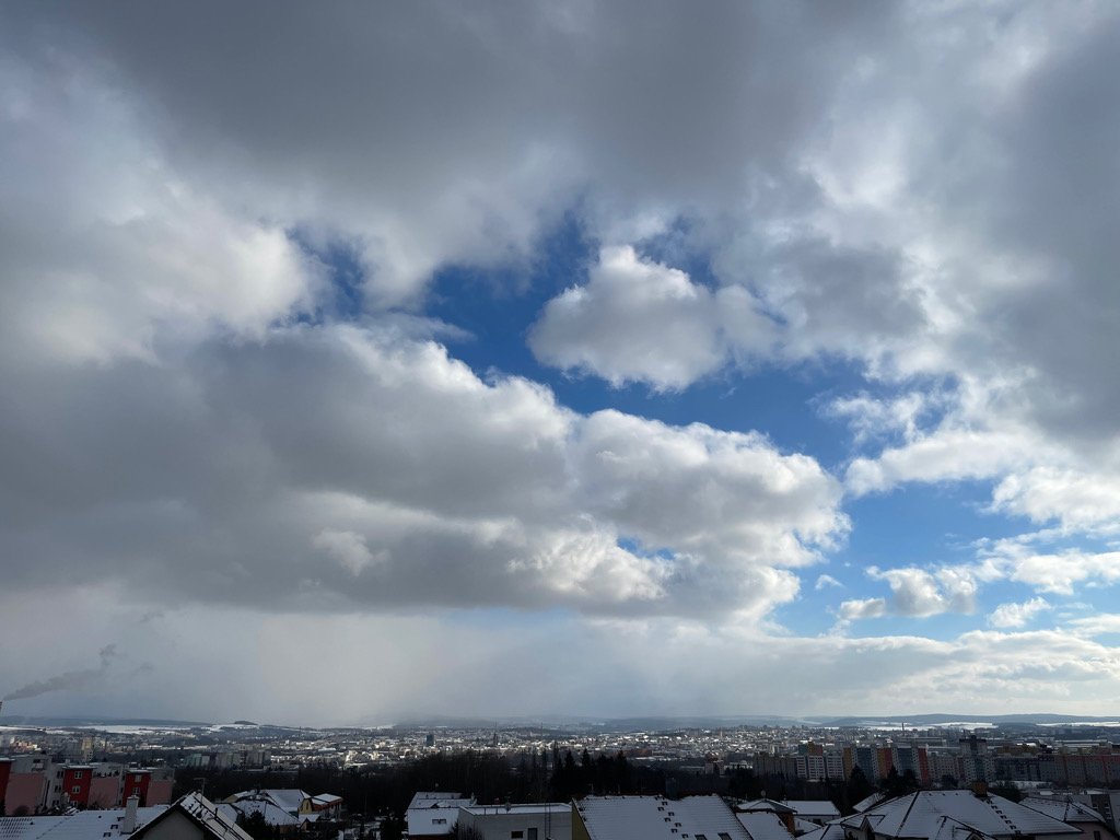 Aktuálně převažuje většinou převážně polojasno a fouká většinou slabý vítr, nádherné počasí, v dálce ojíněné stromy námrazou, vypadá to pěkně